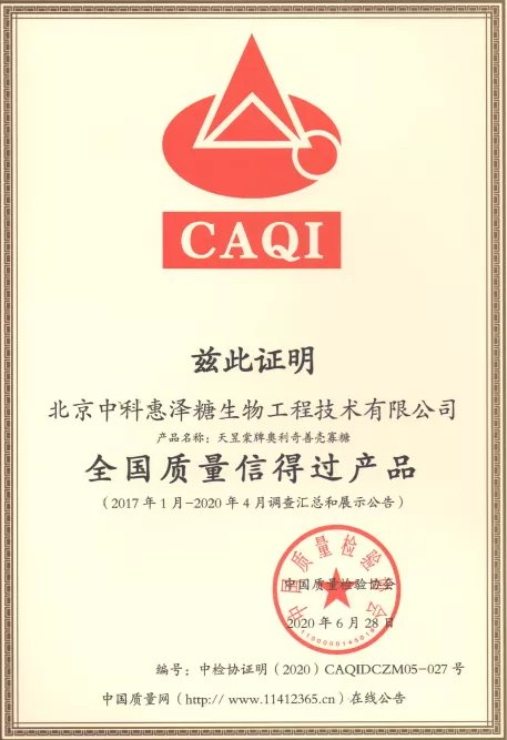這是奧利奇善殼寡糖膠囊自2012年以來連續(xù)9年榮獲由中國質(zhì)量檢驗(yàn)協(xié)會(huì)頒發(fā)的《全國質(zhì)量信得過產(chǎn)品》、《全國質(zhì)量檢驗(yàn)穩(wěn)定合格產(chǎn)品》榮譽(yù)證書。