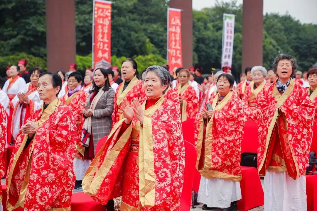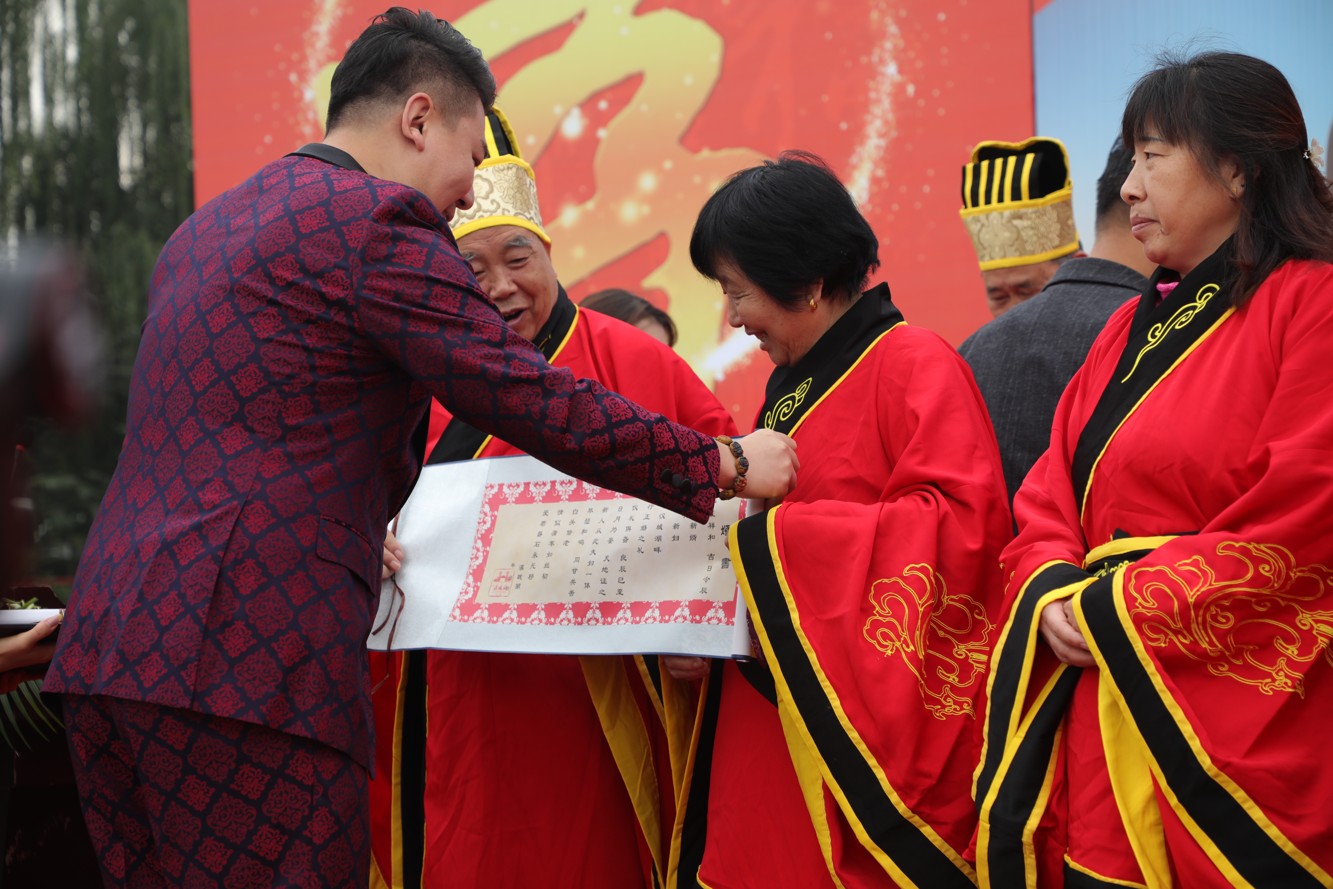 本次愛情孝親節(jié)最大的亮點,是為近百對老年伉儷舉辦了一場以漢式婚禮為藍本的隆重典雅的金婚典禮,女士身著漢代曲裾禮服,男士身著漢代玄端禮服,在贊禮官的唱禮聲中,夫妻就位、首拜天地、夫妻對拜、合巹同杯、互換信物、執(zhí)手盟誓,行禮如儀,以傳承千年的禮制盛典見證愛情的海誓山盟,見證“執(zhí)子之手、與子偕老”一生承諾的浪漫踐行。