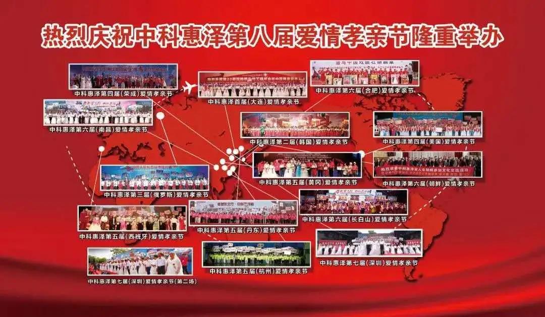 中科惠澤愛情孝親節(jié)2013年在中國大連,2014年在韓國仁川,2015年在俄羅斯莫斯科,2016年在美國洛杉磯和山東榮成,2017年在西班牙馬德里和湖北黃岡、杭州宋城、遼寧丹東,2018年在朝鮮平壤和安徽合肥、江西南昌、吉林長白山,2019年在廣東深圳(兩場),相繼成功舉辦了七屆15場,成為弘揚中國傳統(tǒng)文化、增進中外人民友誼和友好交流的橋梁。時任俄羅斯聯(lián)邦國家杜馬副主席、統(tǒng)一俄羅斯黨副主席熱列茲尼亞克等外國政要多有出席,并發(fā)表熱情洋溢的講話,對中科惠澤愛情孝親節(jié)的舉辦給予了高度贊譽。