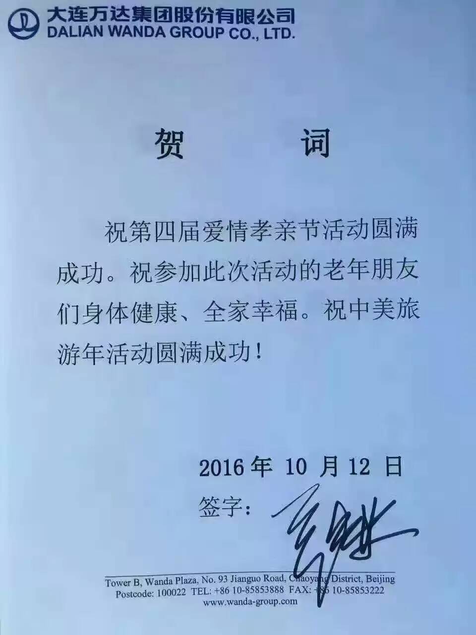 萬達集團董事長王健林特發(fā)來祝賀視頻:“今年是中美旅游年,祝第四屆愛情孝親節(jié)活動成功舉辦。祝參加活動的老年朋友們身體健康、玩的開心。祝中美旅游年圓滿成功!”